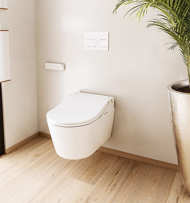 Das neue Washlet Dusch-WC vereint modernste Hygiene- und Komfortfunktionen in einem eleganten Aufsatz. Die vollständig verdeckte, selbstreinigende Düse mit EWATER+ und PREMIST Sprühnebel sorgt für maximale Sauberkeit, während beheizbarer Sitz, Warmlufttrockner, Deodoriser und Nachtbeleuchtung höchsten Komfort bieten.